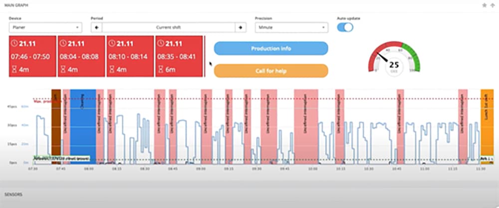 Shop Floor Data is the part that collects information of the overall production in detail. It can be stored separately as WIP (Work In Process) of each WO (Work Order) by the data obtained from the employees operating at the machines. and from Controller Board (Photo Sensor, Power consumption, Motor Speed (Encoder), Temperature)